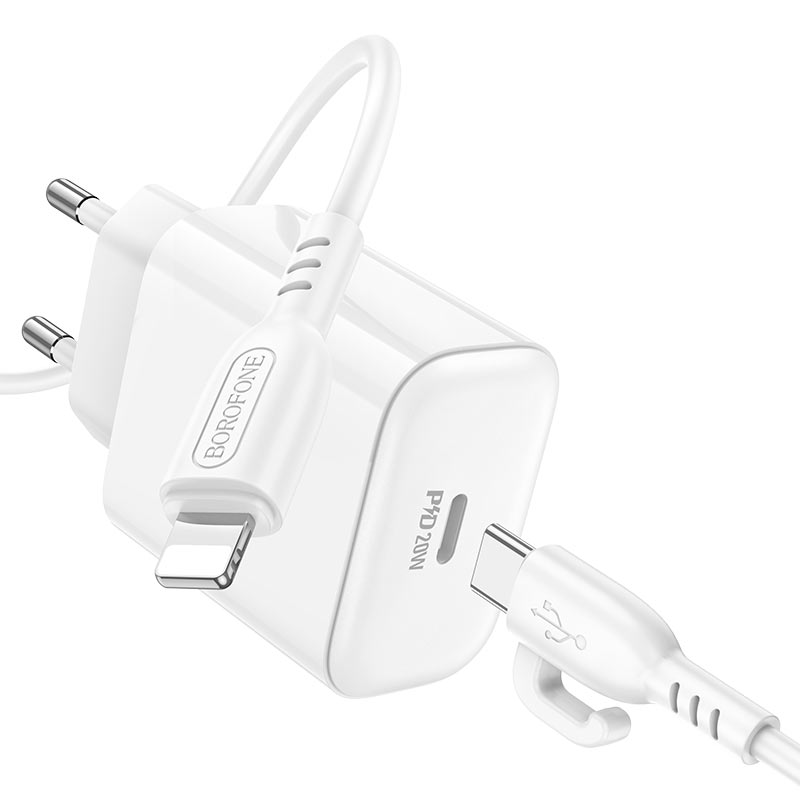 هوكو طقم شاحن جداري منفذ واحد مع كابل - بي دي 20 واط - من تايب سي إلى لايتنينج - أبيض - BA81A-IP
